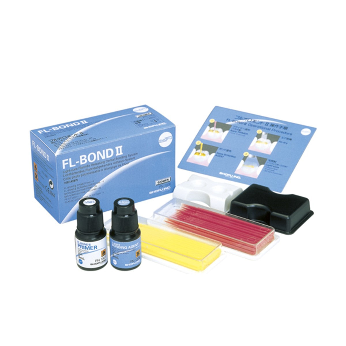 - FL-Bond II Primer 5 ml, FL-Bond II Bonding Agent 5ml, Micro Applicators, Dish with cover & Step card.