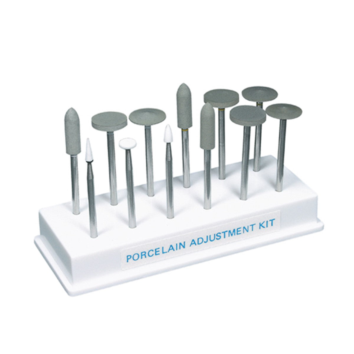 The Porcelain Adjustment Kit has specially selected assortment of white stones and porcelain polishers for chair-side adjustment and glaze like polishing of porcelain restorations prior to placement.